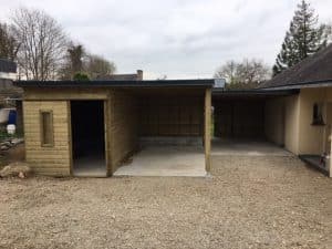 trouver une solution pratique et esthétique pour abriter deux voitures, tout en intégrant un espace de rangement type abri de jardin, le tout sans dénaturer l’aspect de leur maison. Le projet devait s’insérer naturellement sur leur parking existant, juste à côté de la maison.